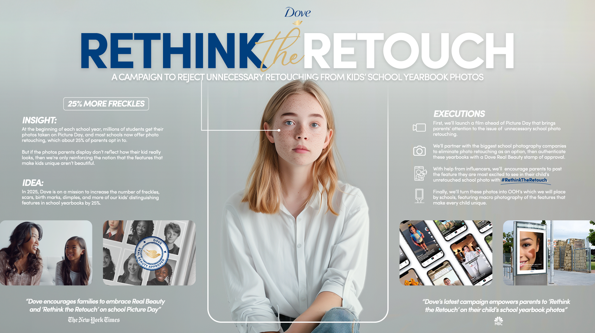 Sometimes great ideas end up in the graveyard — but this one deserved a better send-off. In 2025, we dreamed up a plan with Dove to flip the script on how kids see themselves in one of the most permanent places their image ever lives: the school yearbook. Lately, over-edited, picture-perfect yearbook photos have been trending, and we wanted to hit pause on that. Instead of polished perfection, this idea celebrated the real stuff — freckles, scars, birthmarks, dimples — all the little details that make each kid one-of-a-kind.